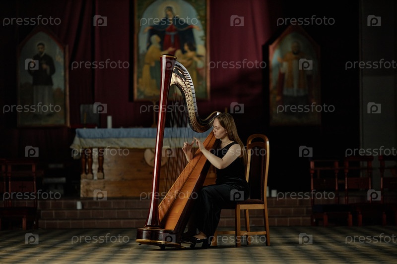 Молодая женщина играет на арфе, исполняя классическую музыку в церкви с низким ключевым светом