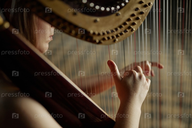 Руки женщины, играющей на арфе, мягко сжимают струны во время выступления в помещении