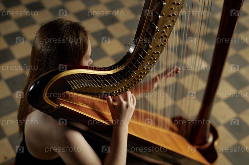 Женщина, играющая музыку на древней деревянной арфе с элегантной гармонической кривой в помещении