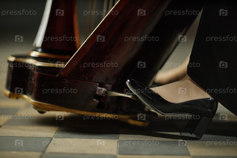 Музыкантка-женщина ногой в чёрных ботинках, бьющая педаль арфы, исполняющая музыку внутри дома