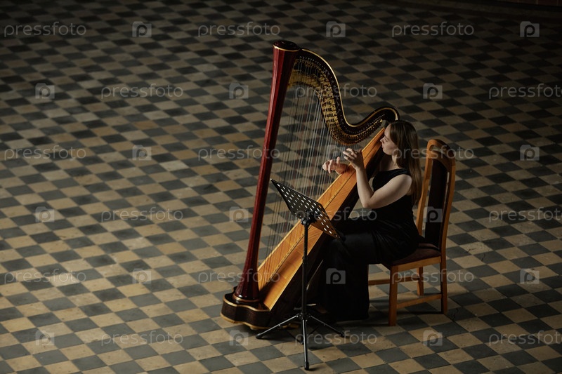 Молодая женщина-музыкант в платье играет музыку на арфе в тусклом свете против чековых плиток