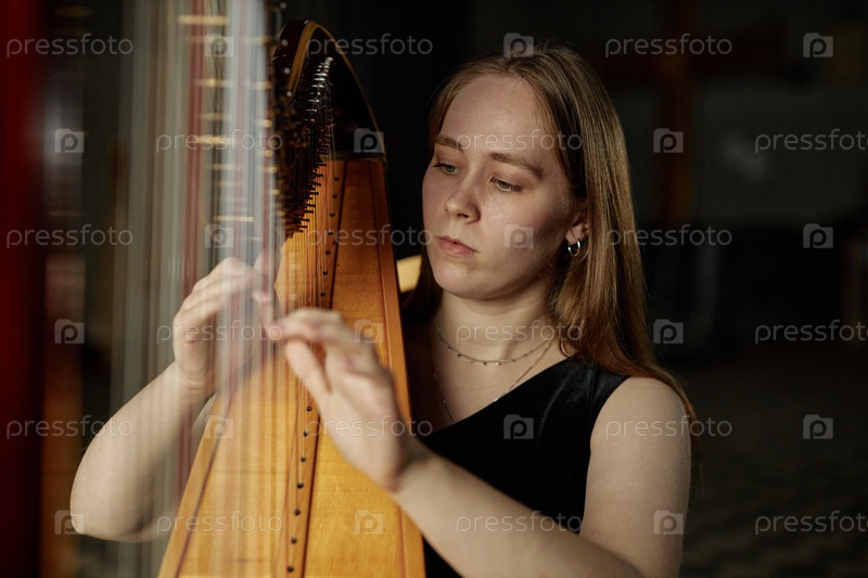 Портрет сосредоточенной женщины, профессионально играющей на арфе, выбивая струны в помещении