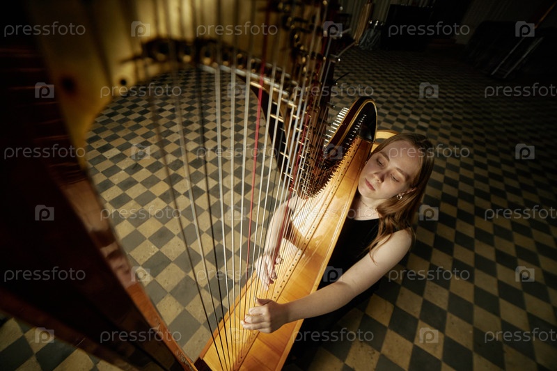 Рыбий глаз женщины-музыканта, играющей на арфе, исполняющей музыку в церкви с квадратным полом