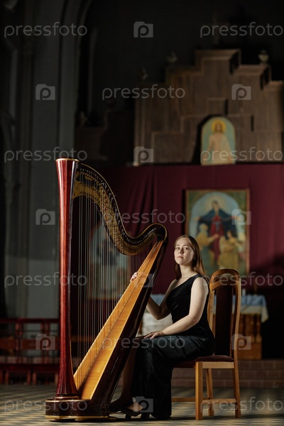 Молодая девушка-арфанистка сидит на стуле, позирует рядом с инструментом в церкви