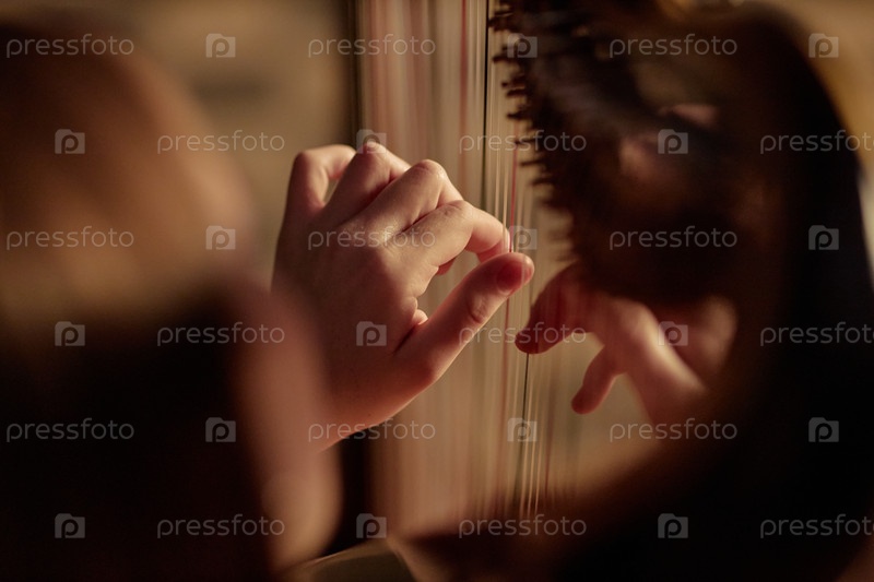 Профессиональная женщина-гарпистка играет на музыке, вытаскивая струны инструмента в помещении
