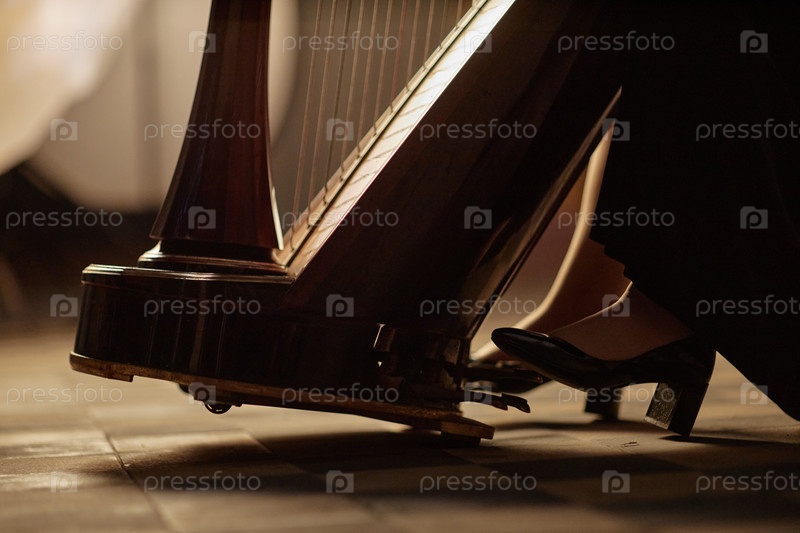 Женская нога в элегантных туфлях, бьющая педаль арфы, исполняющая музыку внутри