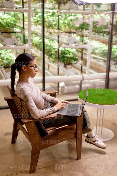Женщина, использующая ноутбук в современном крытом гидропоническом саду