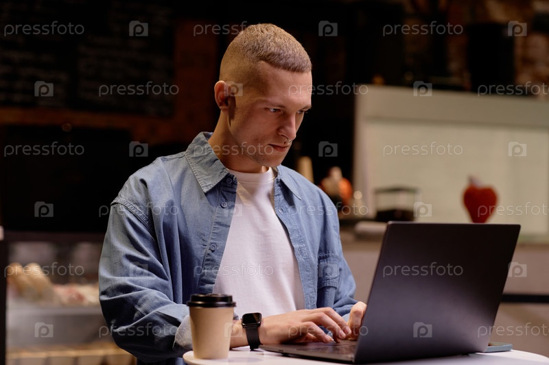 Мужчина, работающий на ноутбуке в уютном кафе