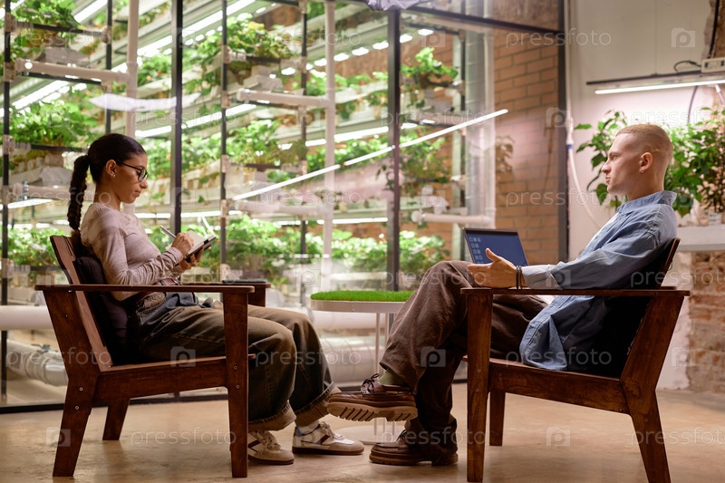 Совместная дискуссия в рабочем пространстве внутреннего сада