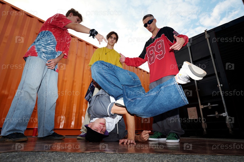 Группа брейк-дансеров позирует в городской промышленной зоне