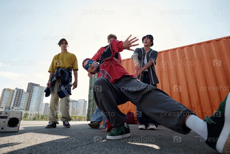 Выполнение танцевальных движений хип-хопа на городской крыше