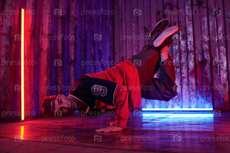 Показывая свои танцевальные навыки под неонами в городской обстановке