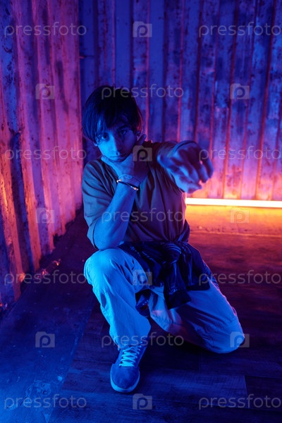 Мужчина танцует в промышленном складе с неоновыми огнями