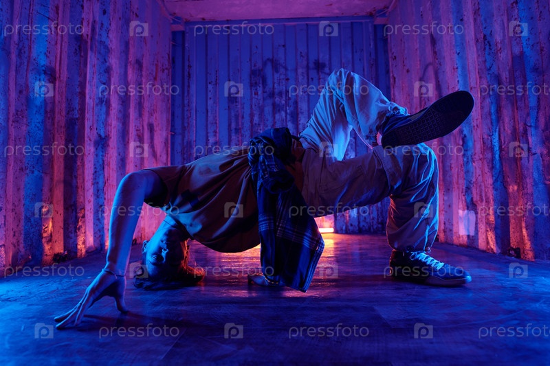 Исполнение современных движений брейк-данса в неоновой комнате