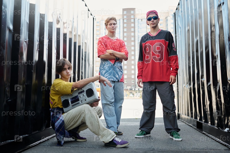 Группа позирует с Boom Box в Urban Alley Setting Group