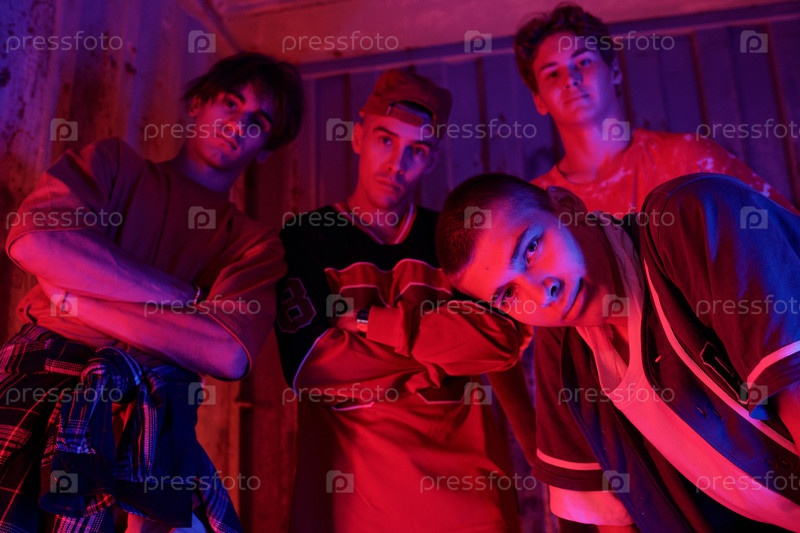 Группа молодых мужчин позирует перед деревянной стеной