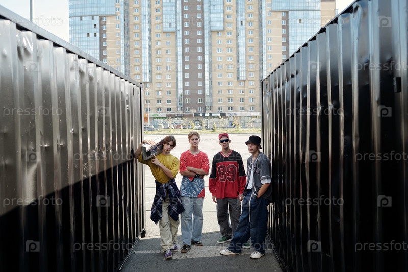 Группа друзей, стоящих между судоходными контейнерами