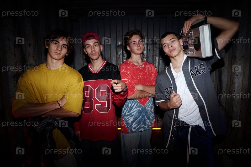 Группа молодых мужчин, позирующих с бумбоксом