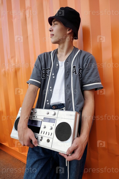 Удерживая винтажный бумбокс на оранжевой стене