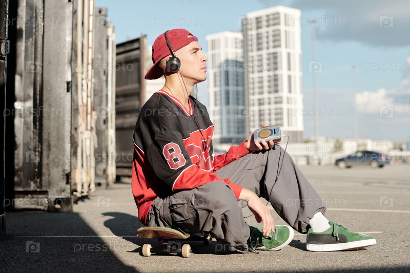 Молодой человек сидит на скейтборде, слушая музыку на свежем воздухе