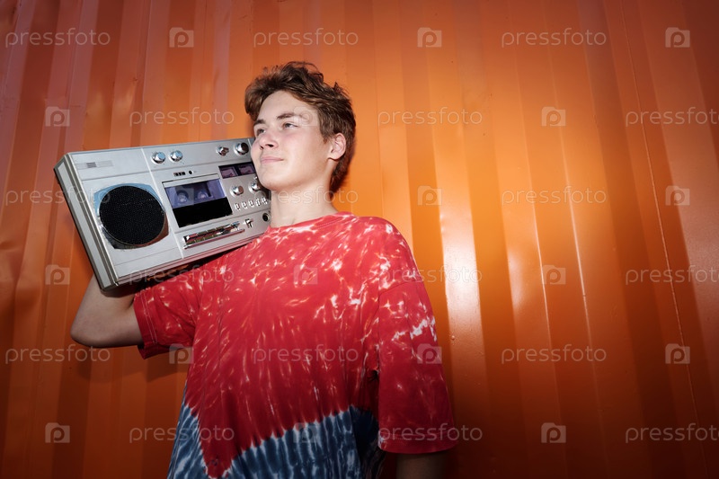Ношение ретро бумбокса против ярко-оранжевой стены