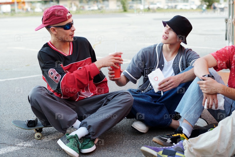 Общаться среди друзей, сидящих на скейтбордах на свежем воздухе