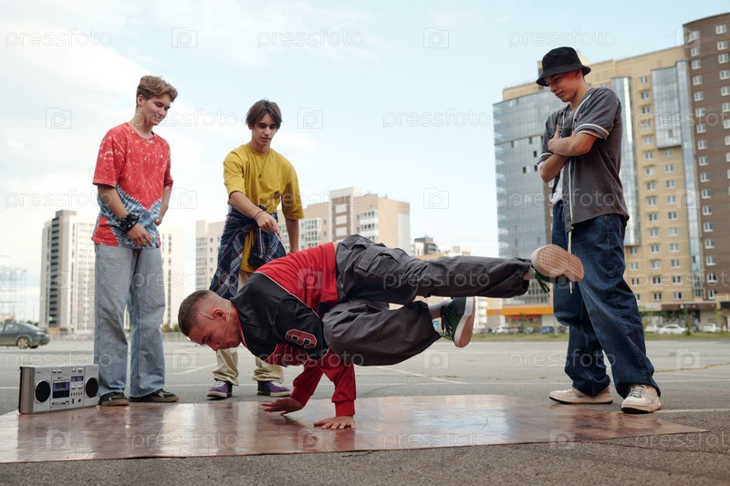 Исполнители брейк-дансов, демонстрирующие навыки уличного танца в открытом воздухе
