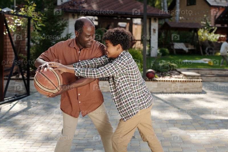 Афроамериканский отец учит сына играть в баскетбол