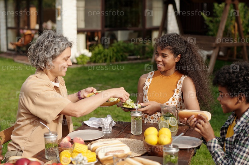 Разделение семейной трапезы на свежем воздухе с улыбающимися родственниками