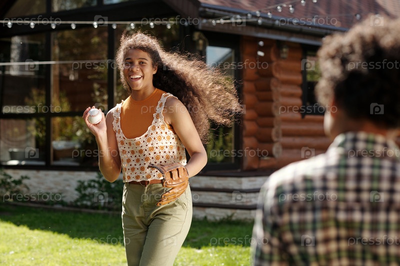 Улыбающийся подросток держит мяч на зеленом дворе
