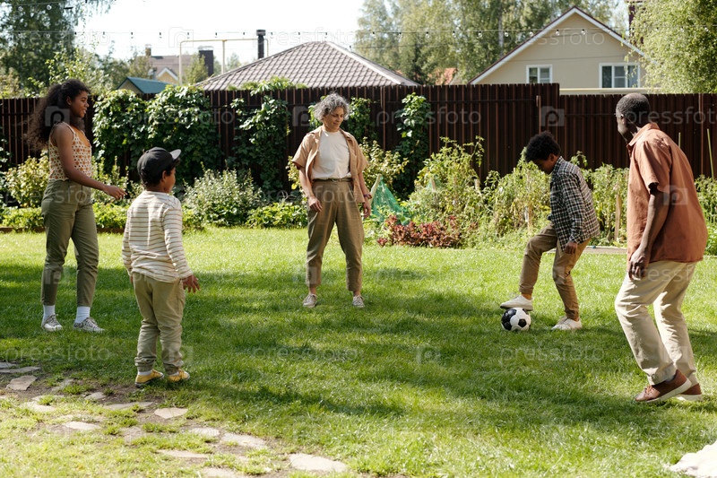 Семья играет в футбол на свежем воздухе в саду