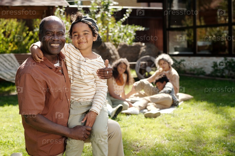 Улыбающийся афроамериканский дед обнимает внука на открытом воздухе