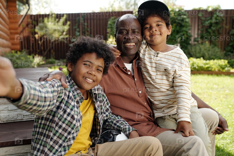 Улыбающийся дедушка обнимает двух счастливых внуков