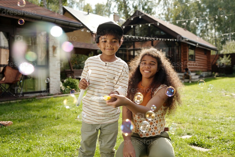 Наслаждаться развлечениями на открытом воздухе с пузырьковой палочкой в саду