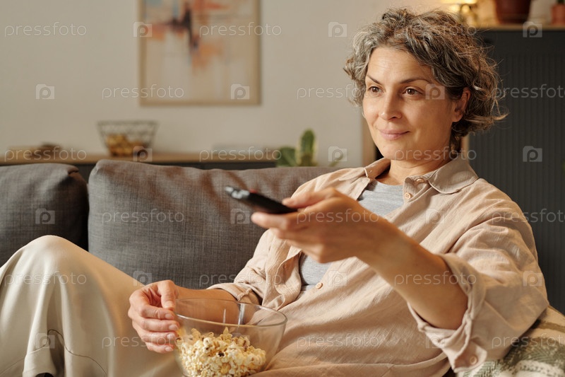 Смотреть телевизор на диване, едя попкорн
