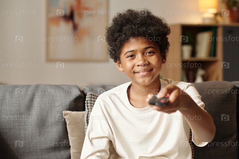 Смотреть телевизор, держа дистанционное на диване в помещении