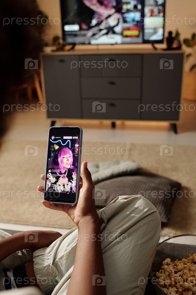 Просмотр телевизора и использование смартфона в комфортной гостиной
