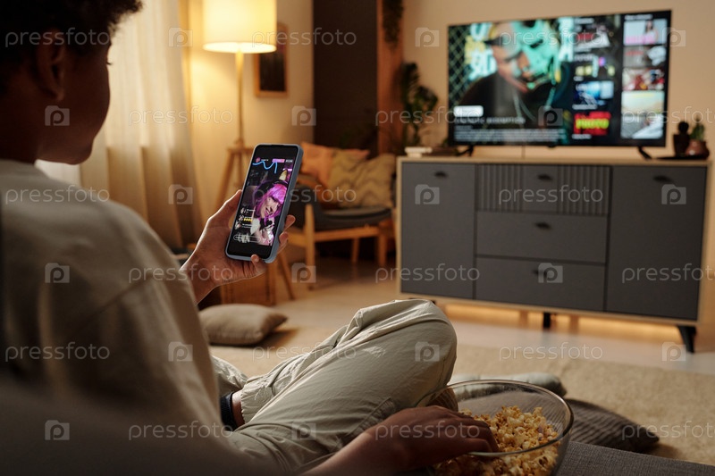 Расслабление дома, просмотр телевизора и проверка телефонных уведомлений