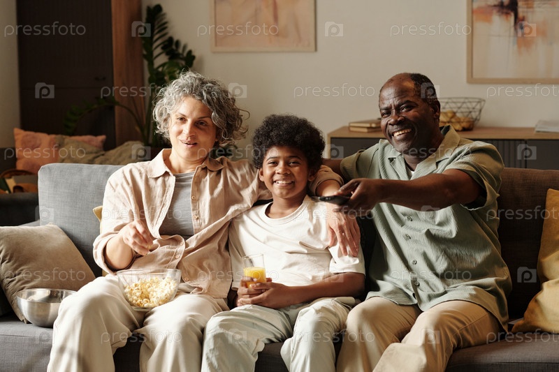 Смотреть телевизор с семьей, наслаждаясь закусками на диване
