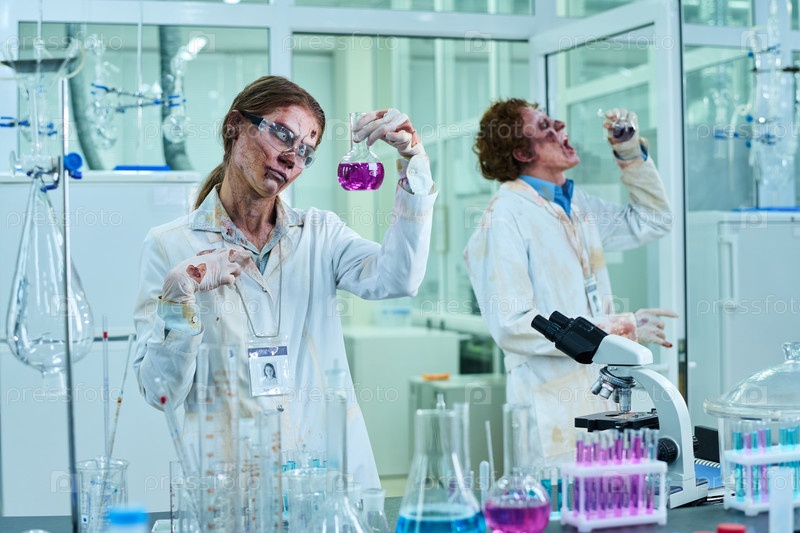 Два лаборанта Walking Dead в кровавых пальто работают с реагентами