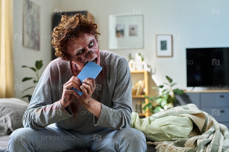 Странный мужской мертвец кусает смартфон