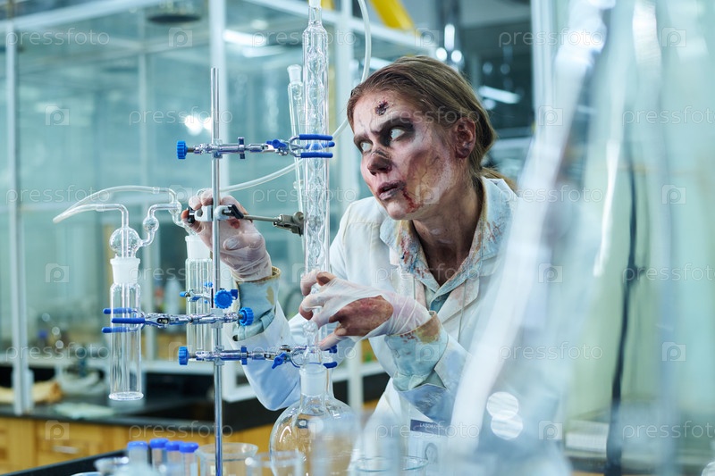Женщина-зомби с гнилой кожей лица в лаборатории
