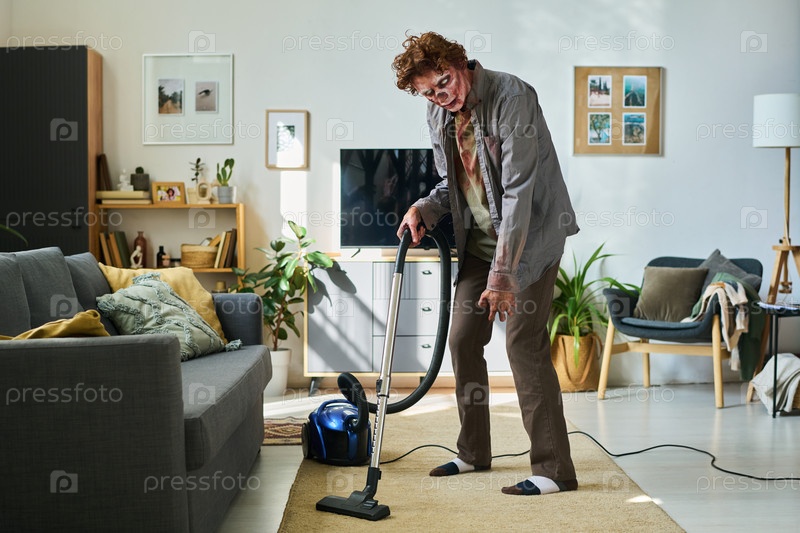 Молодой мужской зомби, использующий пылесос