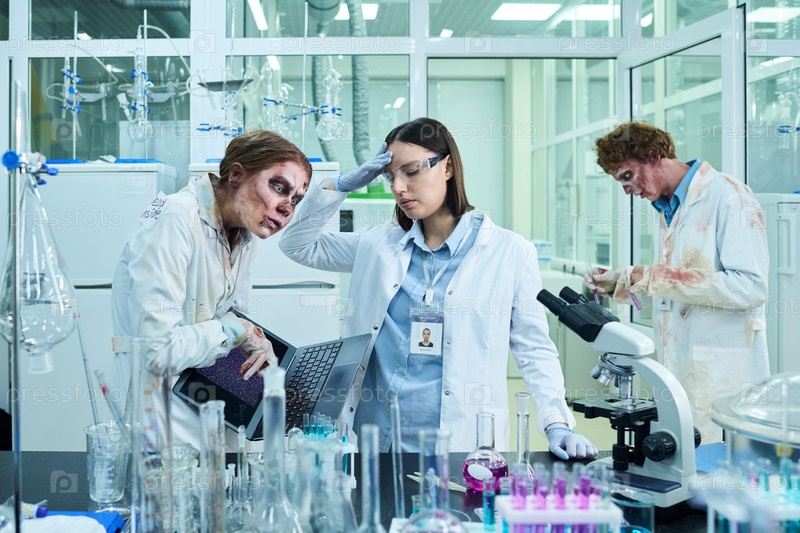 Фрустрированная женщина-учёный работает с коллегами зомби в лаборатории