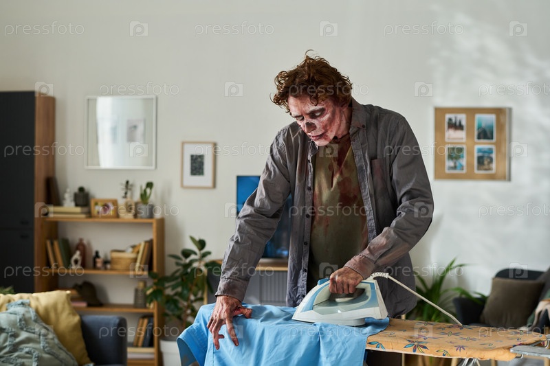 Непогибший мужчина гладит рубашку Молодой