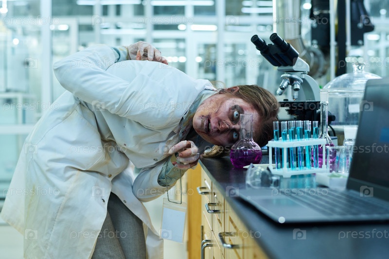 Ужасный зомби смотрит на токсичную жидкость в бутылке