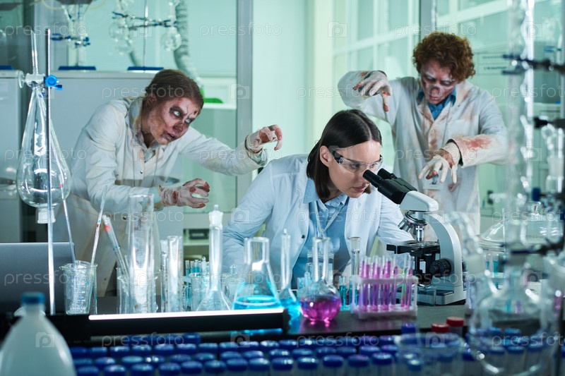 Смелая молодая женщина работает в лаборатории, полной зомби