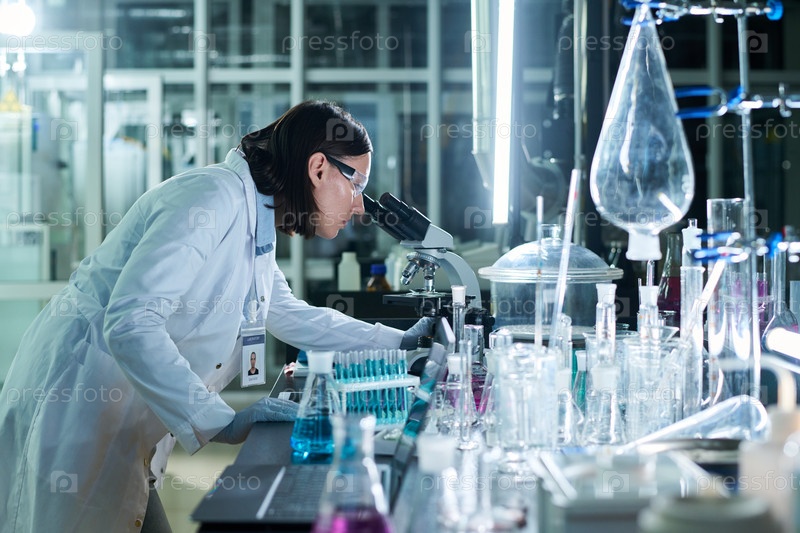 Молодая женщина, работающая в лаборатории ночью