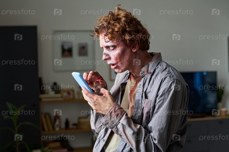 Молодой мертвец-мужчина, использующий смартфон