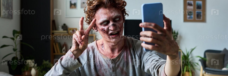 Молодой зомби делает селфи на заголовке смартфона